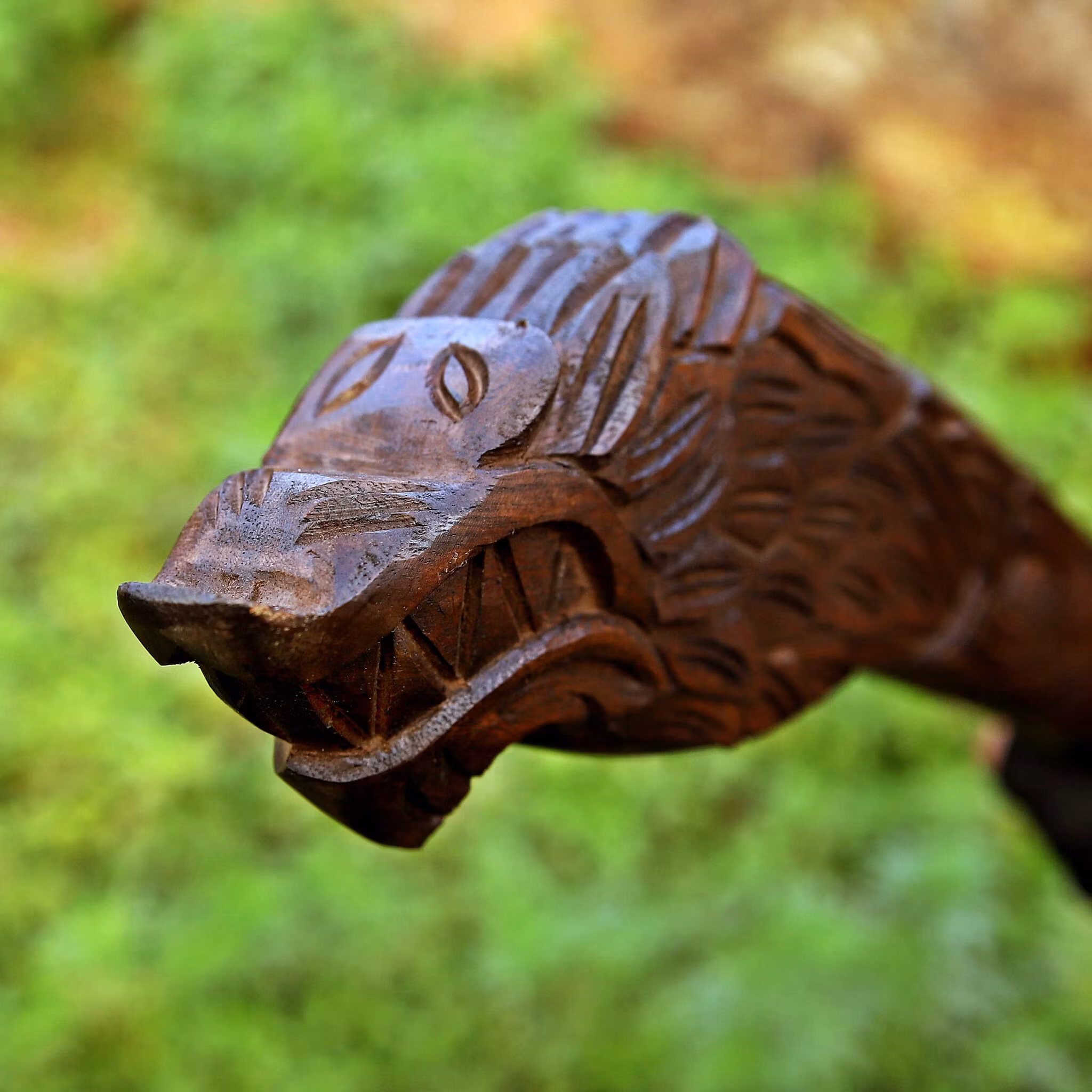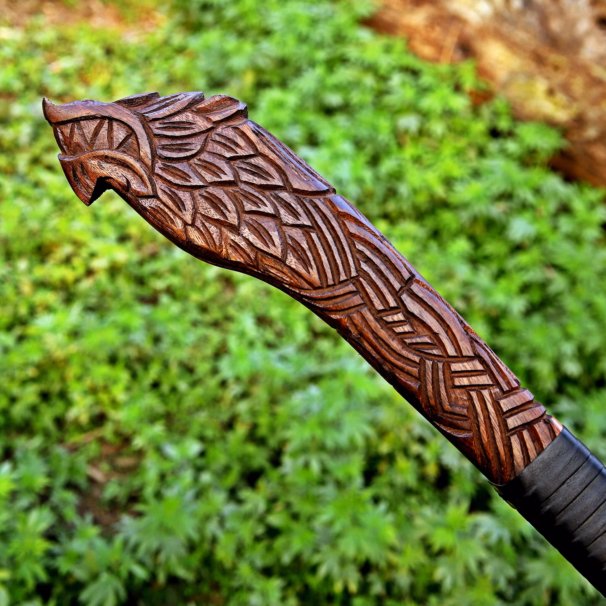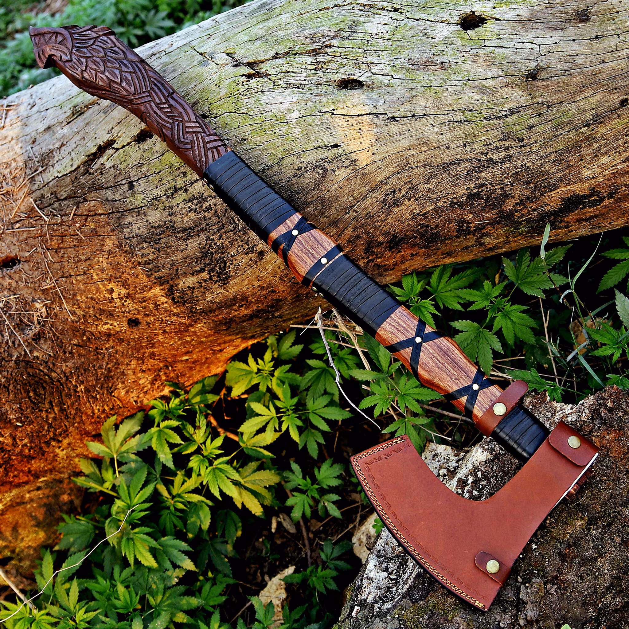 Håndtaksmateriale: Håndskåret asketre med detaljerte nordiske graveringer for overlegent grep, komfort og holdbarhet.